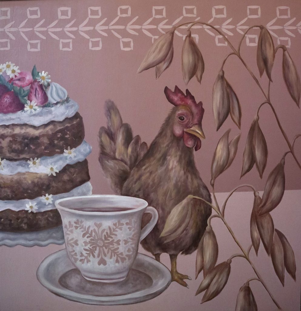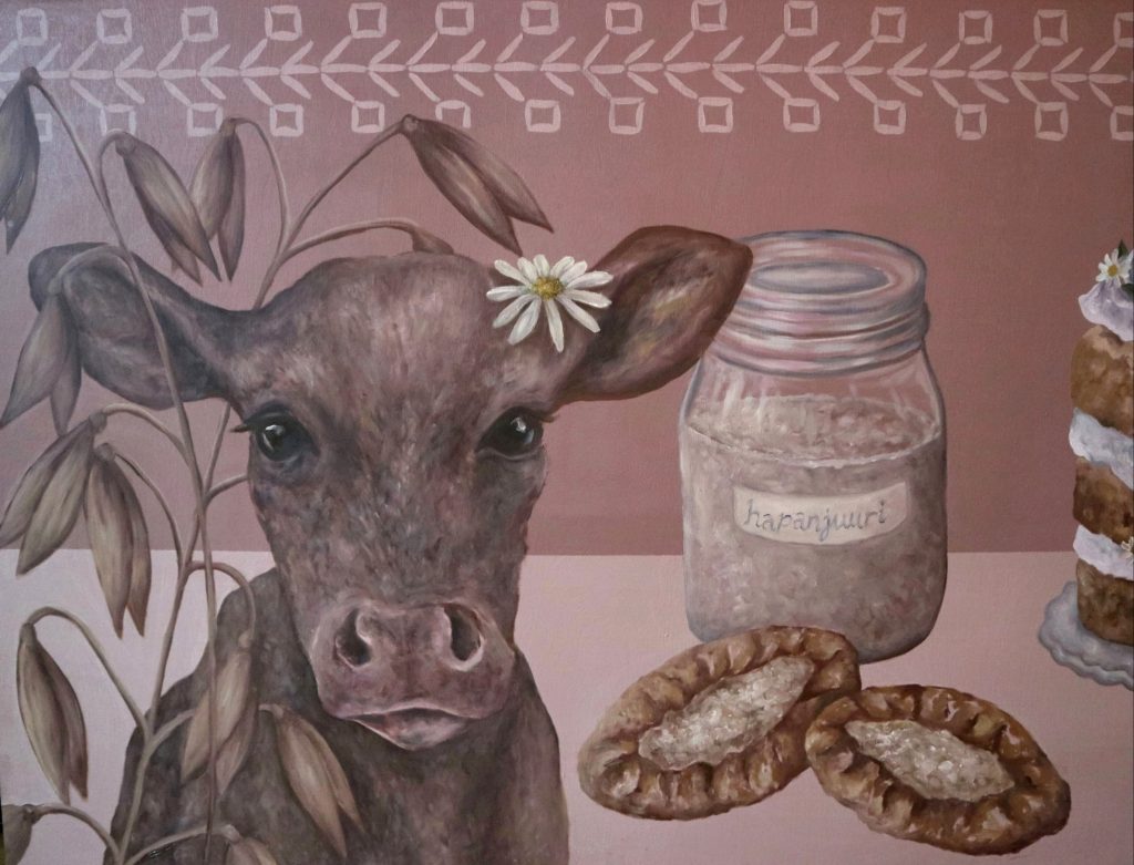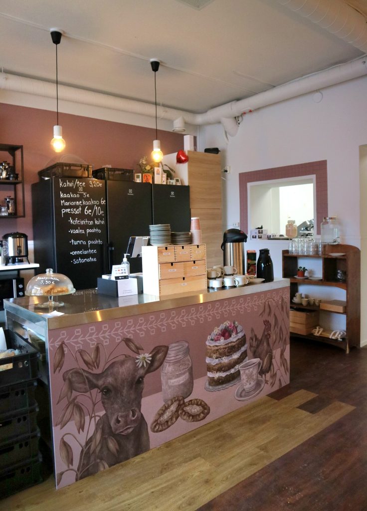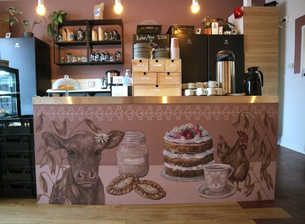 Myymälässä ja kahvilassa voit nauttia leipomon tuoksusta, ihanista mauista ja muun muassa paikallisen kuvataiteilijan Senni Koskenvesan maalauksesta myyntitiskillämme. Sennin muitakin töitä löytyy instagramista.